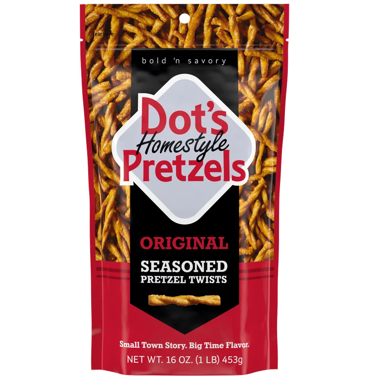 Get ready for the snack adventure of your life! Dot's Homestyle Original Seasoned Pretzel Twists are braided and dusted with our original, top-secret seasoning blend. Each pretzel twist envelopes your taste buds in a delightful swirl of buttery, sweet, and spicy tang. These seasoned pretzels have no cholesterol, trans fat, saturated fat, or added sugar. Dot's Pretzels are completely fish-free, providing a safe and flavourful snack option for those with seafood allergies. The 16-ounce family size bag is the perfect size for you and your family to enjoy. Whether you're watching sports, going for a picnic, at the office, watching a movie, or on the go, Dot's Homestyle Pretzels are the snack you never knew you needed. Before you know it, you'll be reaching for the next bag!